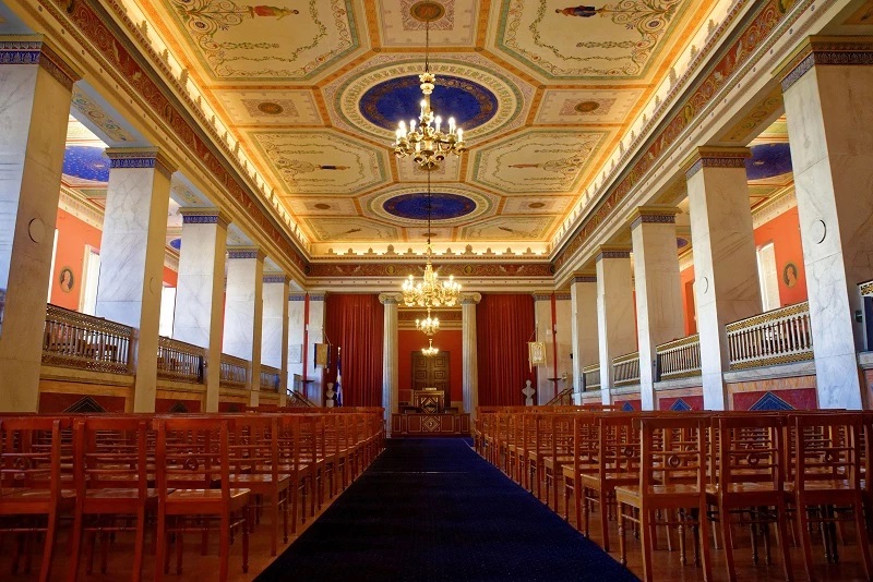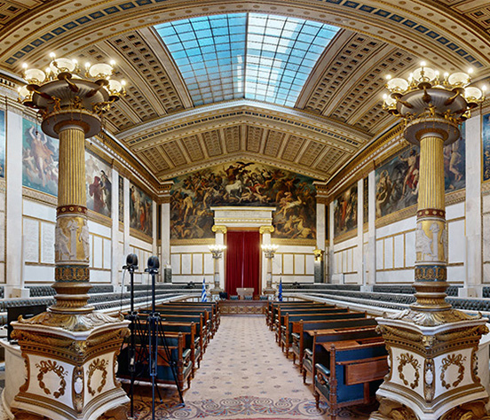 The Great Hall of the National and Kapodistrian University of Athens, that is the first Greek Institution of Higher Education, is located in the “Main Building” of the University, one of the oldest neo-classical buildings of the city of Athens. The “Main Builiding” together with the Academy of Athens and the National Library compose the so called “Neo-classical Trilogy”. It was built under the supervision of the German engineer Edward Schaubert, following the plan created by the Danish architect Christian Hansen.